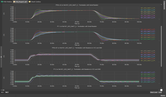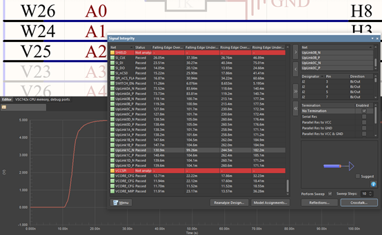 在布局階段要在 PCB仿真中檢查的其他一些重要仿真指標是反射和串擾。這兩者都可以使用 PCB 編輯器中的輕量級 2D 求解器進行評估,結果可以在時域中的圖形上進行可視化。這些功能非常適合快速識別關鍵網絡上的干擾(串擾模擬)或快速確定互連中的端接需求。也出現在 PCB布局仿真中的 SPICE 的一項重要功能是能夠使用參數掃描來迭代可能的終端值。這些結果可以顯示在一系列重疊曲線上以進行比較。