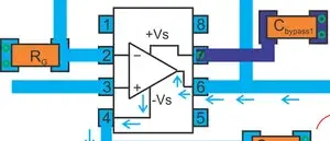 正確放置去耦電容至關重要。下面的電路顯示了與IC并聯放置的兩個去耦電容器。